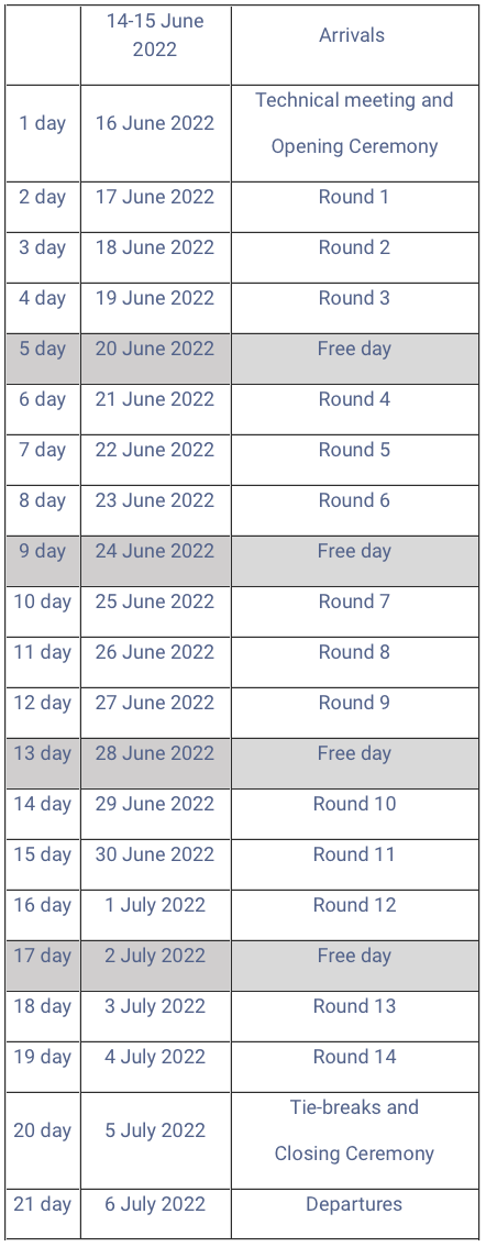 Οκτώ διακεκριμένοι γκραν μάστερ θα διαγωνιστούν για την πρώτη θέση σε ένα τουρνουά double round-robin (όλοι παίζουν μεταξύ τους από δύο φορές) από τις 16 Ιουνίου έως τις 6 Ιουλίου. Το πρόγραμμα περιλαμβάνει τέσσερις ημέρες ρεπό, μία μετά από κάθε τρεις γύρους: